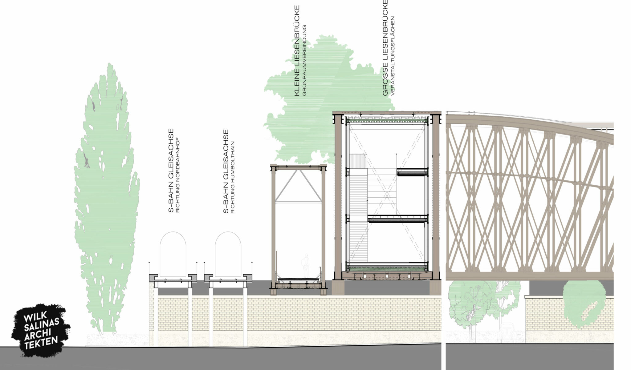 The project is being realized according to the plans of Ana Salinas and Gilbert Wilk, who are also the creative and executive architects of the multifunctional area. The clients and cooperation partners are CapRate GmbH.  With their project idea, the architects are pursuing two goals at once: on the one hand, the restoration of the two historic Liesenbrücken in accordance with the preservation order, giving them a new use,  and the creation of a continuous green link between the two parks via the smaller bridge.