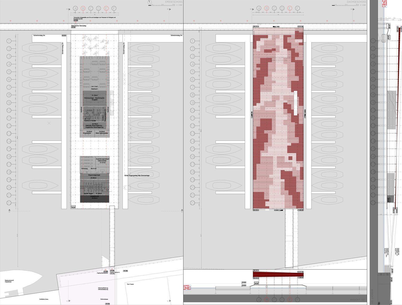 La Marina estará compuesta por dos elementos: la pasarela en la que podrán atracarse barcos de recreo y un nuevo edificio que actuará de puente entre tierra firme y la pasarela en sí.